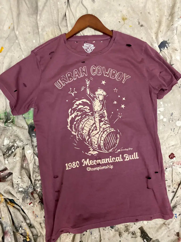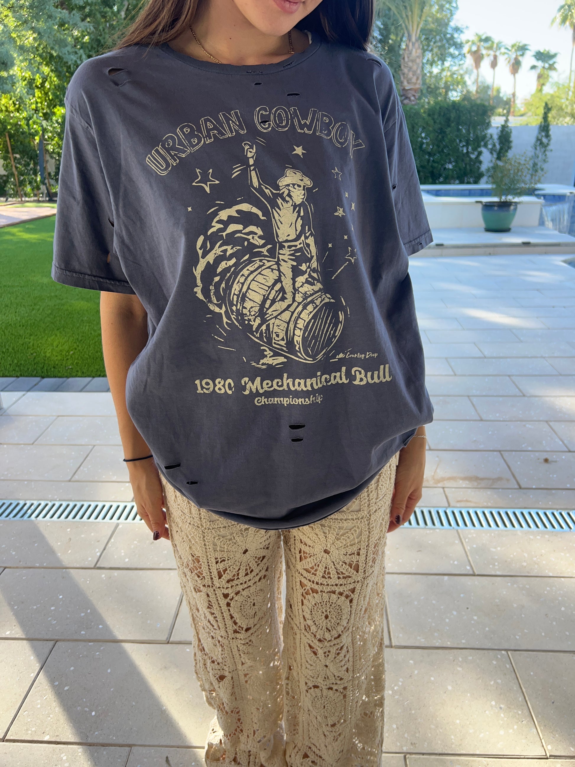 Distressed graphic tee with a laid-back fit and lived-in vibe. Soft, comfy, giving all the cowgirl vibes. Model wearing size XL.