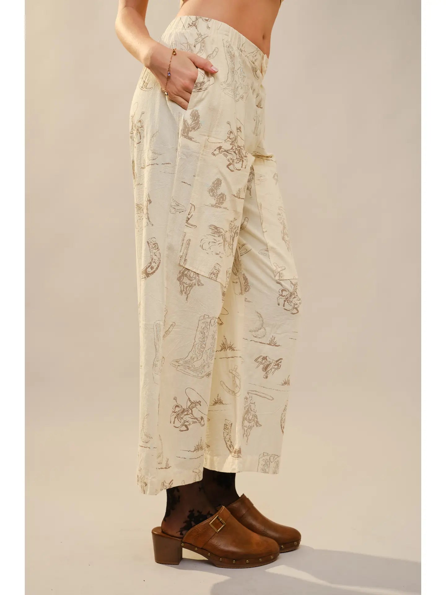 Washed pants with western sketch print — boots, cacti, hats, all the cute cowgirl stuff. Comfy, relaxed, and lowkey iconic.