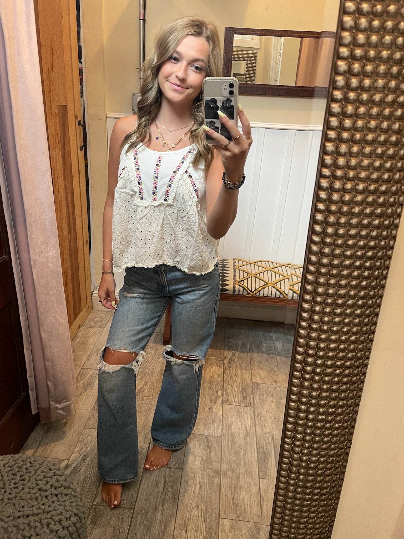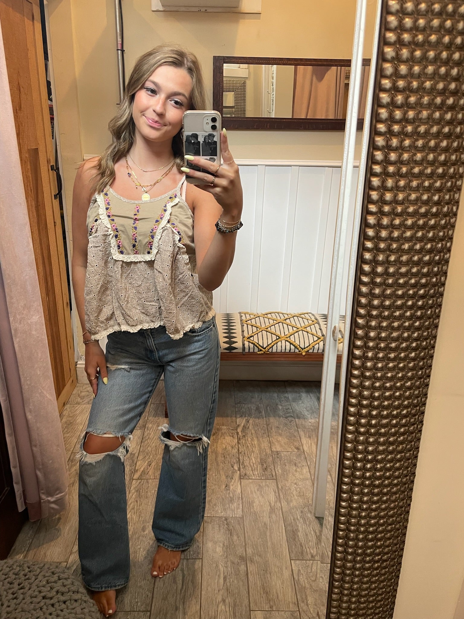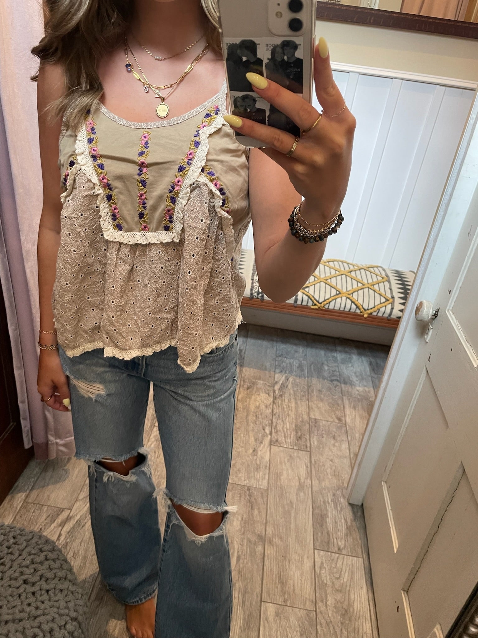 A vintage-inspired tank with floral embroidery, eyelet lace, and a breezy, crinkled texture. Comfy, effortless, and cute with cargos or cutoffs. Available in Taupe or ivory.