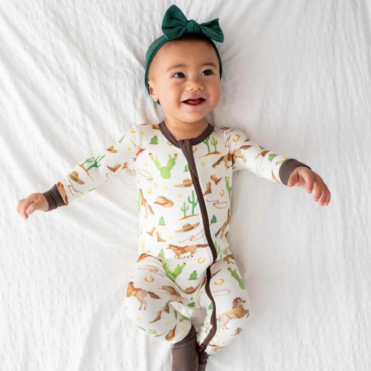 Bamboo zip footie in the cutest cactus + cowboy print. buttery-soft, breathable, and gentle on baby’s skin. fold-over hand + foot cuffs to keep little ones cozy + scratch-free.