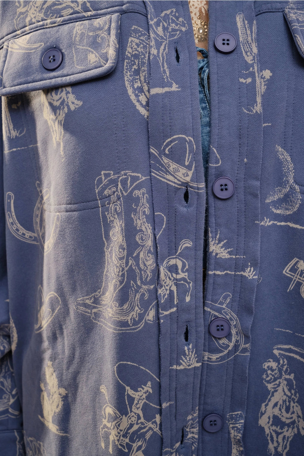 The shacket I’m wearing until further notice: allover western print, relaxed fit, and made from 100% cotton — soft and breathable. available in taupe + denim blue.